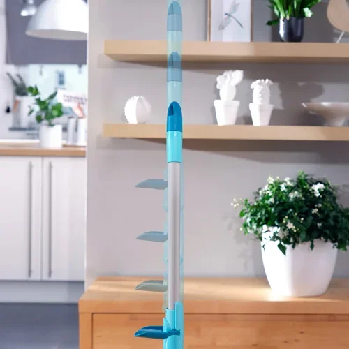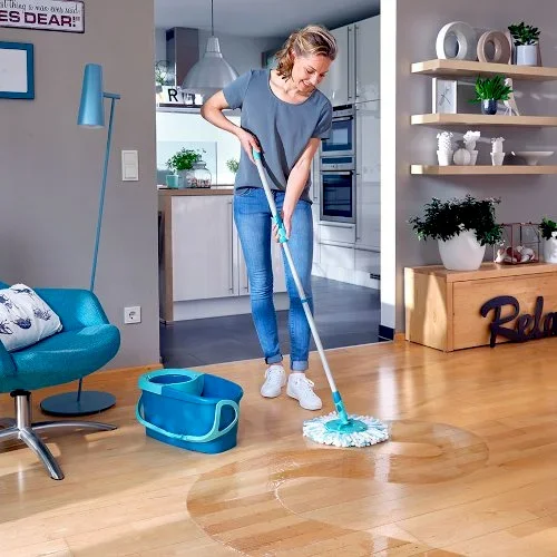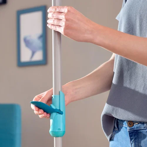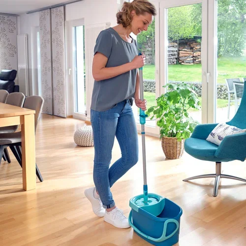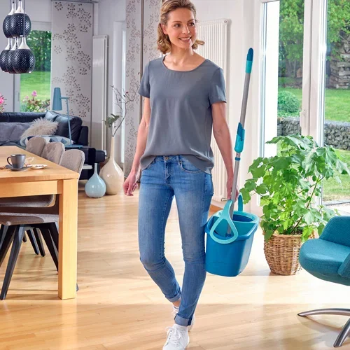 Il set di Leifheit è composto da un manico telescopico con meccanismo , che consente di strizzare le frange stando in piedi. Ciò consente una pulizia comoda del mop senza fare sforzi e senza immergere le mani nell'acqua sporca. Il set è composto da un manico telescopico, un secchio con strizzatore rotante e un lavapavimenti a frange micro Duo!