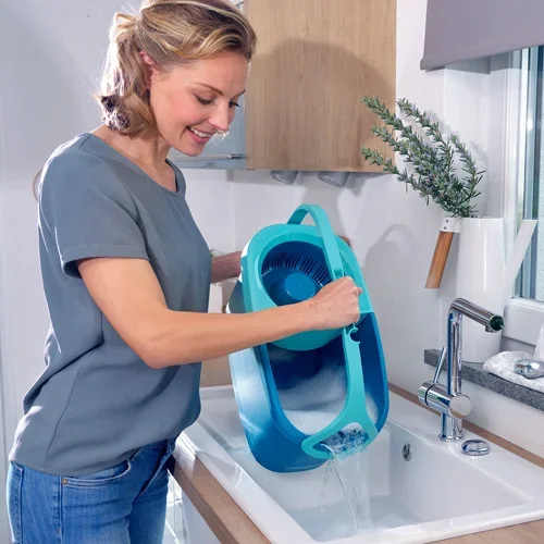 - Si trasporta facilmente e si ripone in modo compatto grazie all’impugnatura del secchio con supporto per il manico